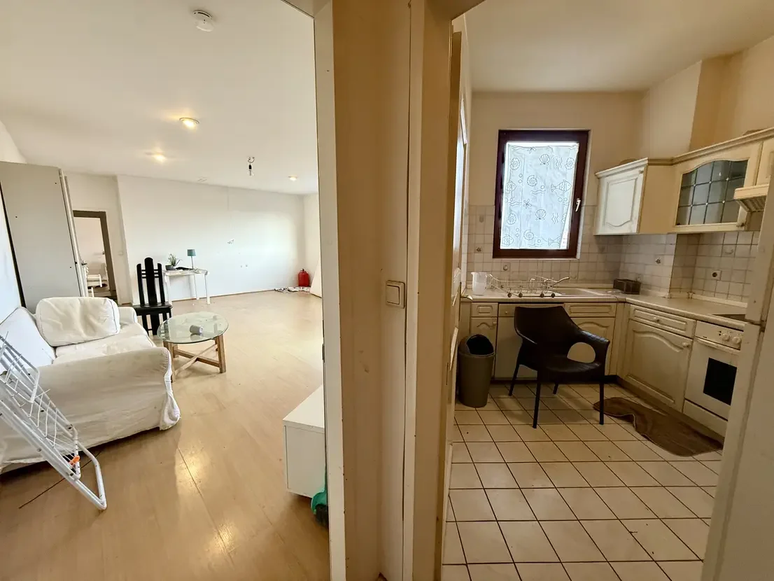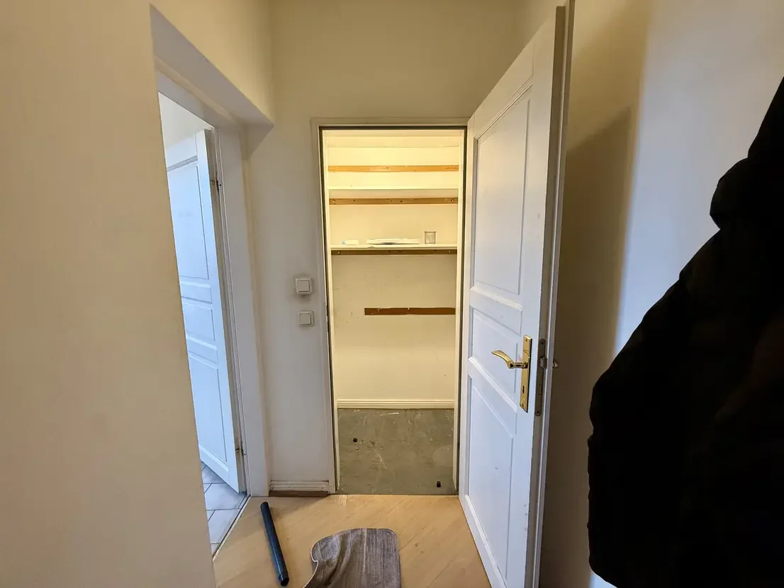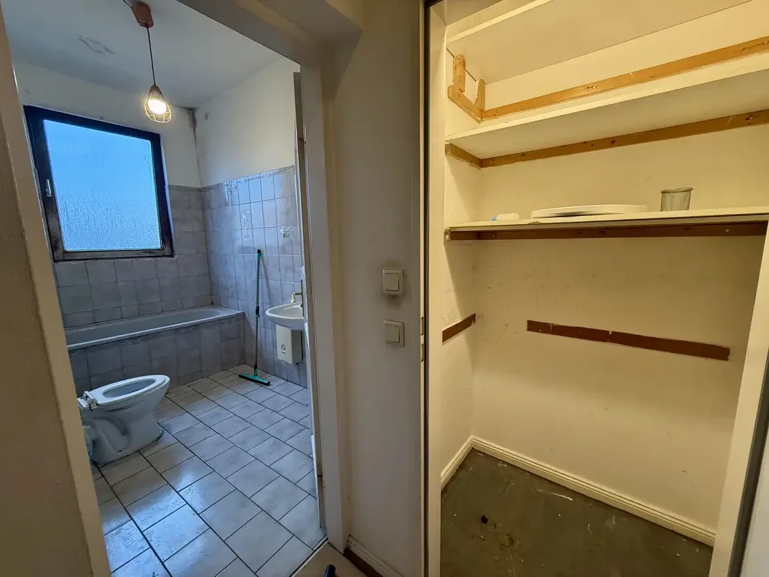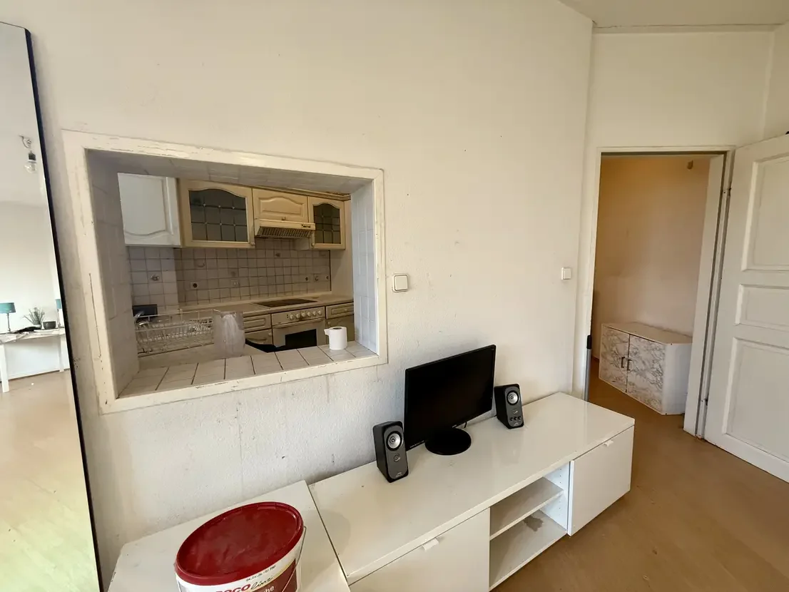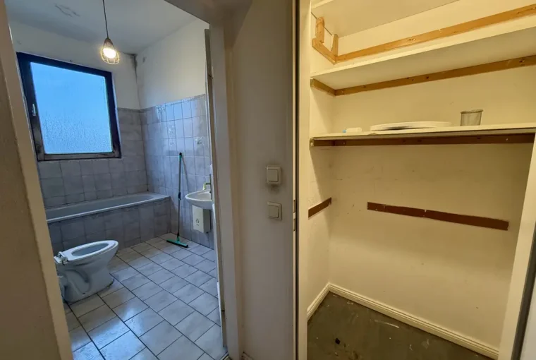 Der Zugang zur Wohnung erfolgt über einen zentralen Flur, von dem aus die verschiedenen Bereiche der Wohnung erschlossen werden. Auf der rechten Seite des Eingangsbereichs befindet sich das Tageslichtbadezimmer, welches mit einer Badewanne ausgestattet ist. Ebenfalls auf dieser Seite liegt ein großzügiger Abstellraum, der zusätzlichen Stauraum innerhalb der Wohnung bietet. Auf der linken Seite des Flures befindet sich die Küche, die über eine praktische Durchreiche zum angrenzenden Wohnzimmer verfügt. Das Wohnzimmer präsentiert sich großzügig geschnitten und bildet den zentralen Wohnbereich der Wohnung.
