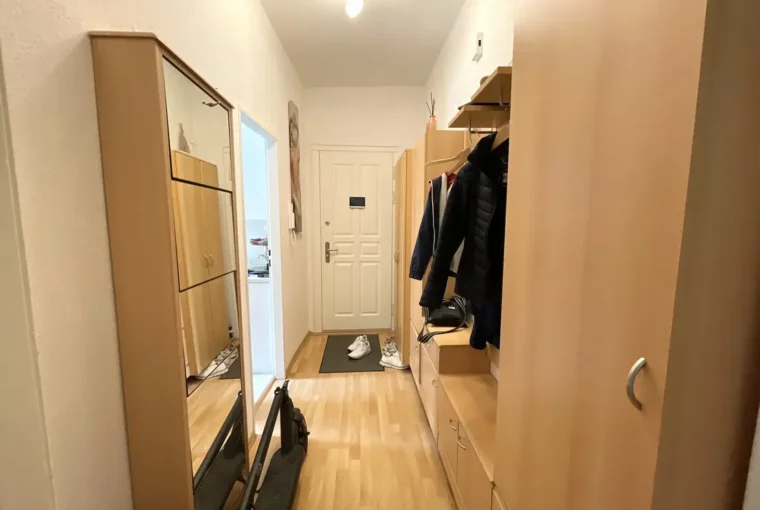 Die Wohnung wird über einen zentralen Flur betreten, der Zugang zur Küche und zum Wohnzimmer ermöglicht. Vom Wohnzimmer aus gelangt man in einen zweiten kleinen Flur, von dem Schlafzimmer, Kinderzimmer und Badezimmer erreichbar sind. Eine flexible Raumgestaltung ist möglich – beispielsweise lässt sich die Trennwand zwischen Schlaf- und Kinderzimmer entfernen.