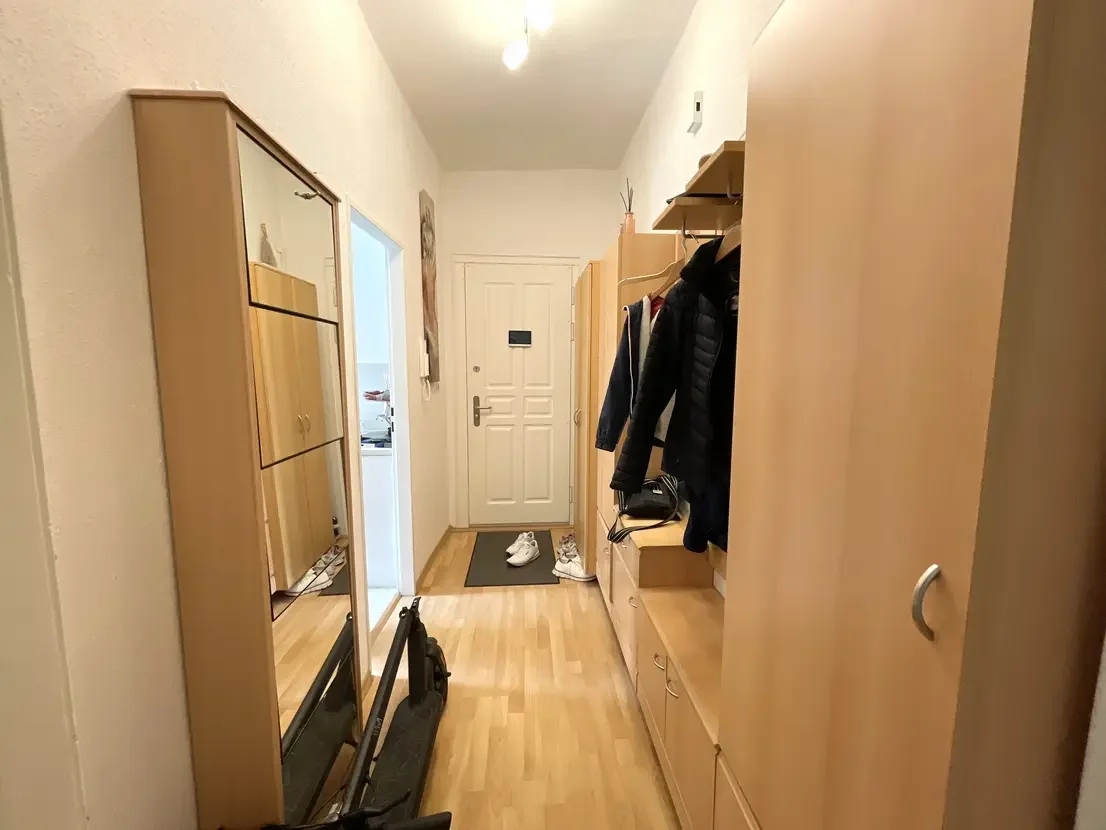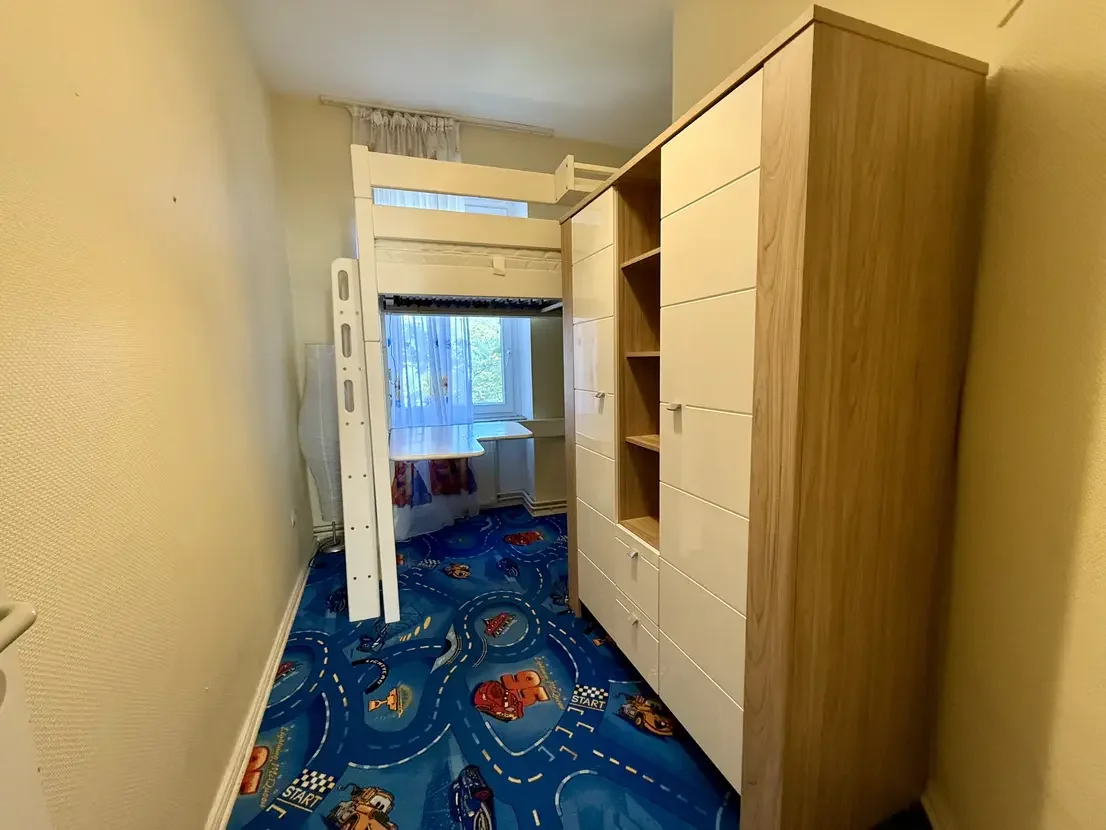 Die Wohnung wird über einen zentralen Flur betreten, der Zugang zur Küche und zum Wohnzimmer ermöglicht. Vom Wohnzimmer aus gelangt man in einen zweiten kleinen Flur, von dem Schlafzimmer, Kinderzimmer und Badezimmer erreichbar sind. Eine flexible Raumgestaltung ist möglich – beispielsweise lässt sich die Trennwand zwischen Schlaf- und Kinderzimmer entfernen.