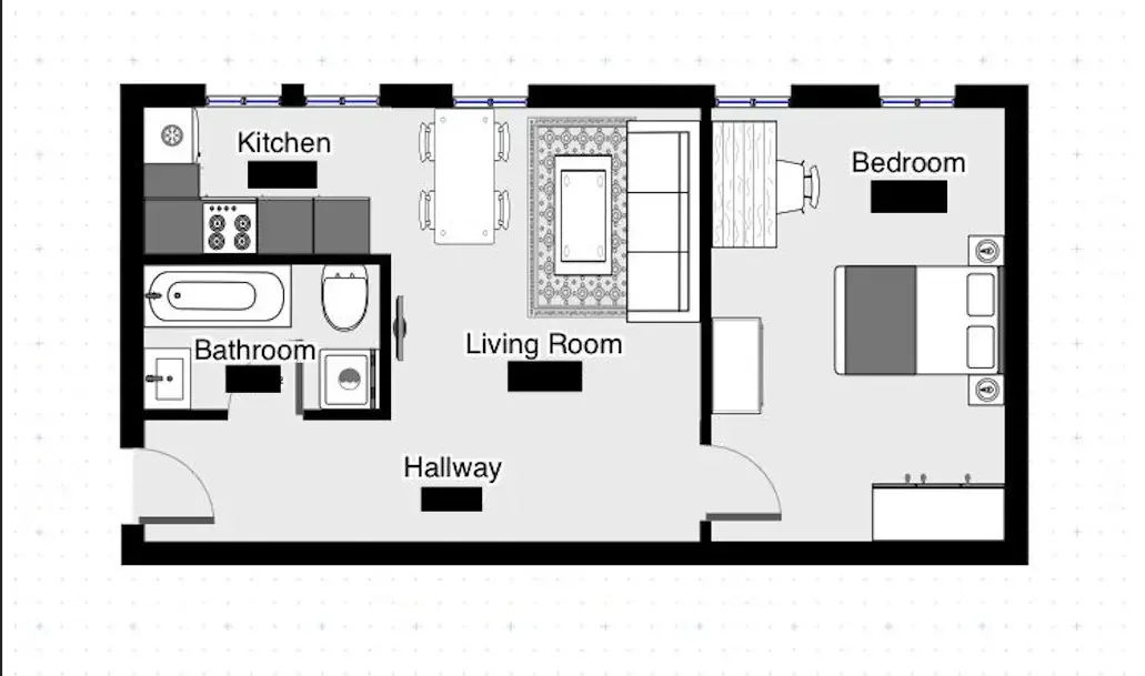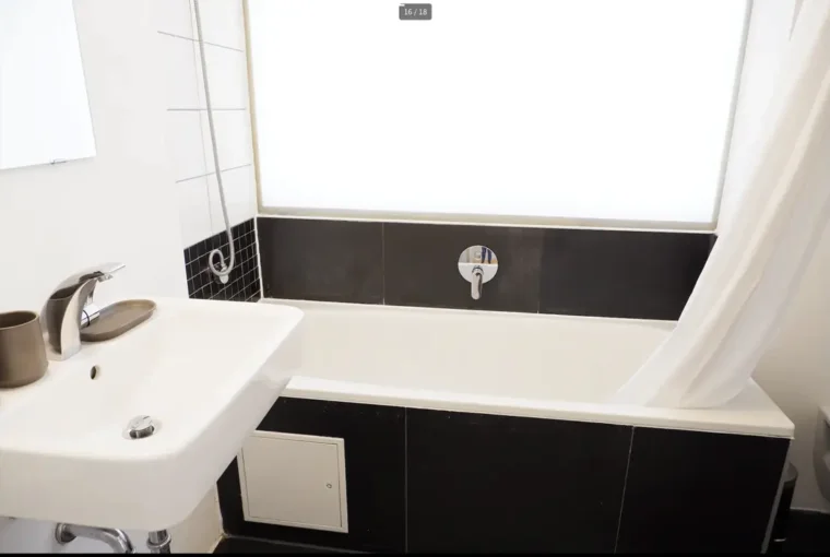 Bereits beim Betreten der Wohnung empfängt Sie ein durchdachter Grundriss mit klarer Raumstruktur. Direkt im Eingangsbereich befindet sich das Badezimmer, das mit einer Badewanne ausgestattet ist und sich funktional sowie stilvoll in das Gesamtbild der Wohnung einfügt. Das offen gestaltete Wohnzimmer bildet das Herzstück der Einheit. Hier wurde eine moderne Einbauküche harmonisch integriert, sodass ein großzügiger Wohn- und Essbereich entsteht, der sowohl für den Alltag als auch für Gäste ideale Voraussetzungen bietet. Von hier aus gelangen Sie in das geräumige Schlafzimmer, das ausreichend Platz für ein großes Bett sowie zusätzliche Stauraumlösungen bietet und sich als ruhiger Rückzugsort präsentiert.