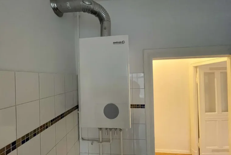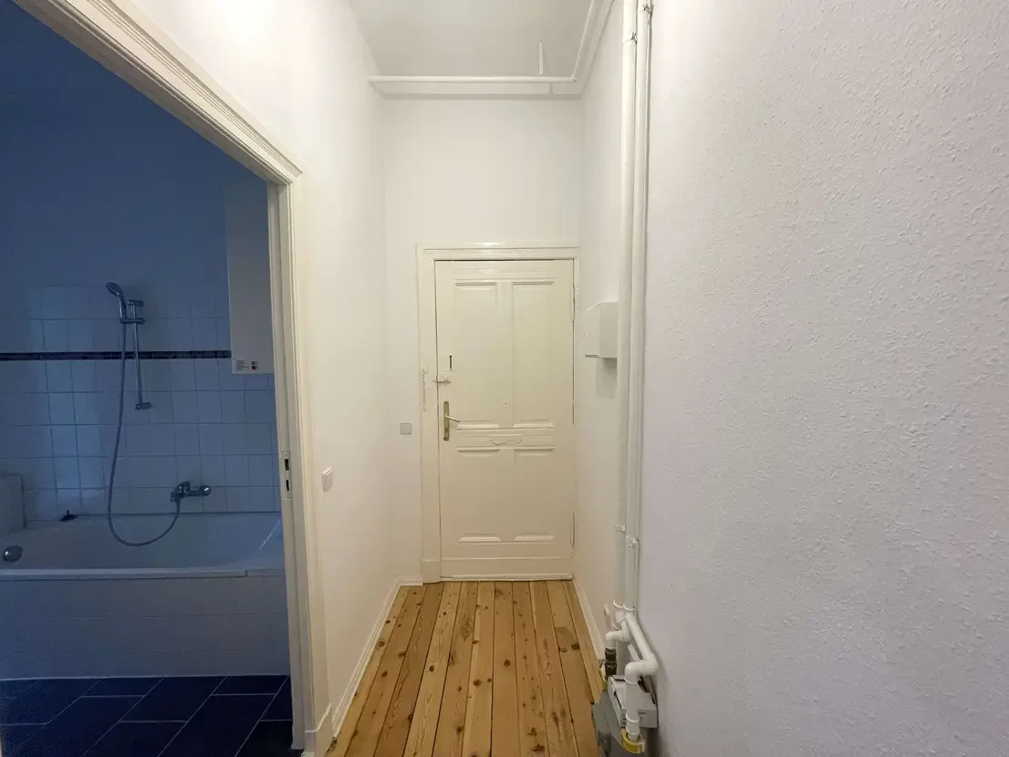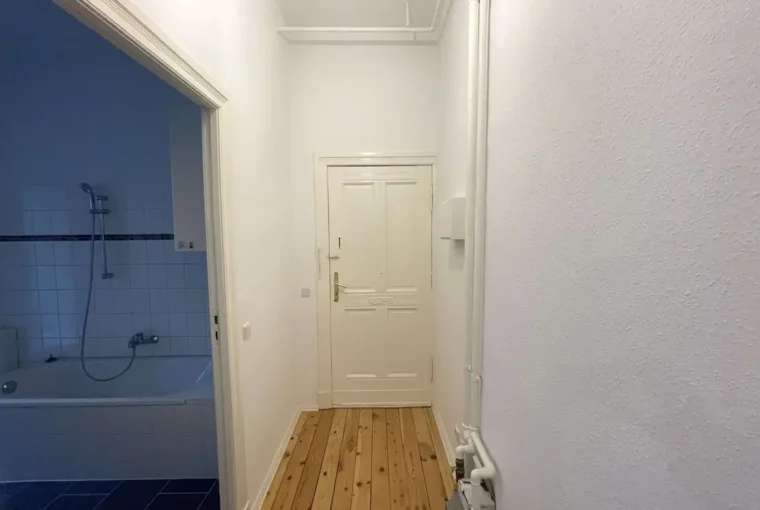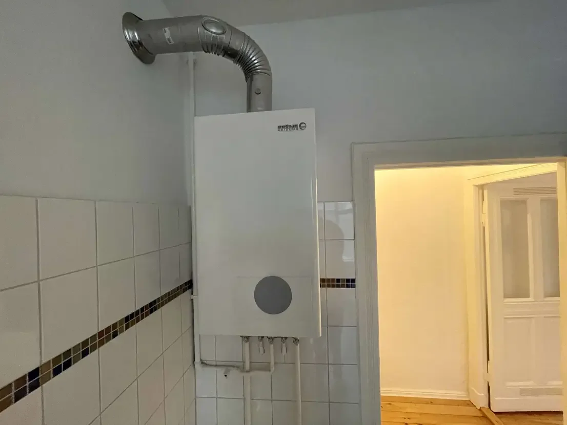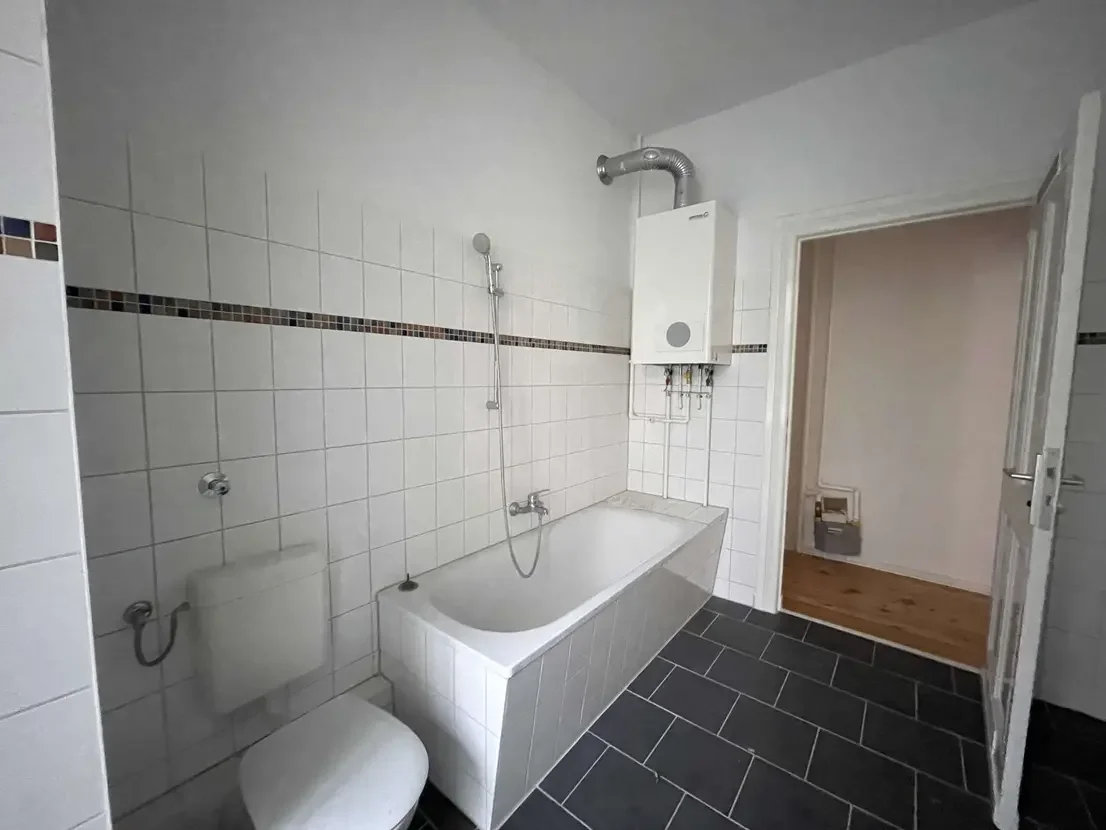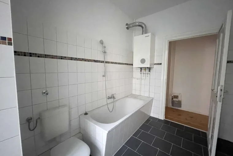 Beim Betreten der Wohnung gelangen Sie in die offen gestaltete Wohnküche, die mit einer vollständig eingerichteten Einbauküche ausgestattet ist. Das Badezimmer befindet sich unmittelbar im Eingangsbereich und ist über den Flur zugänglich. Es verfügt über eine Badewanne, einen Handtuchheizkörper sowie eine moderne Gasetagenheizung, die ebenfalls im Badezimmer installiert ist.