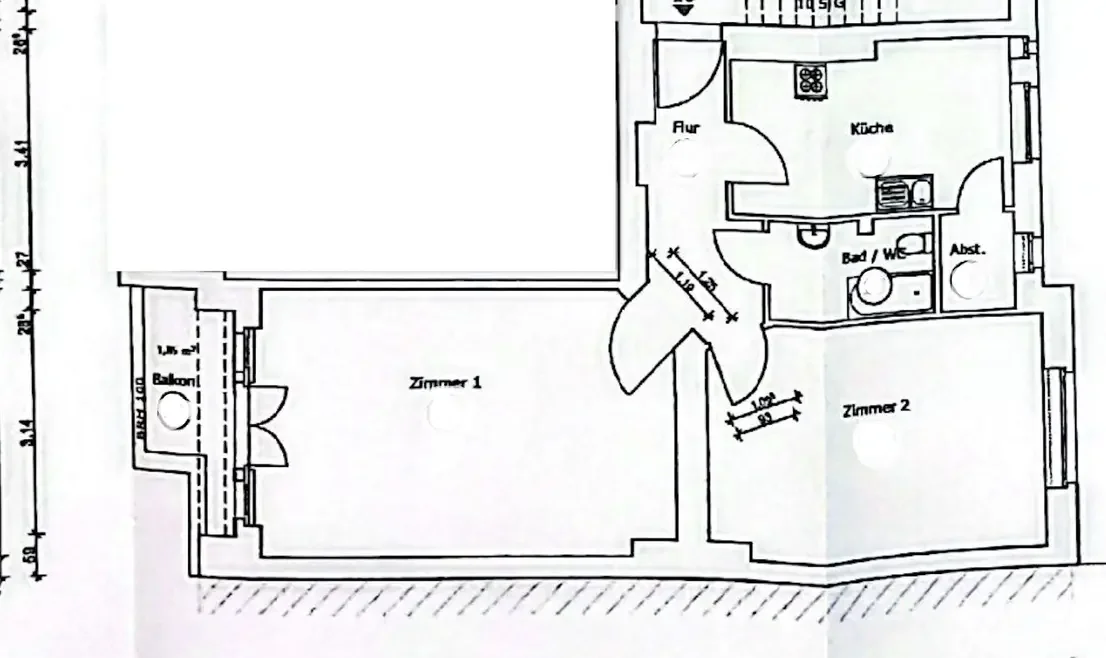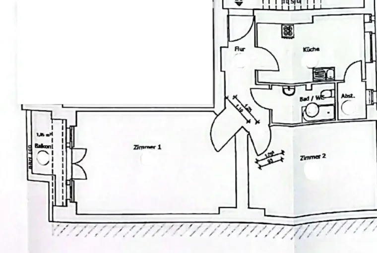+ Praktischer Grundriss: Flur, links geräumige Küche, anschließend Bad, am Ende zwei Wohnräume