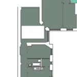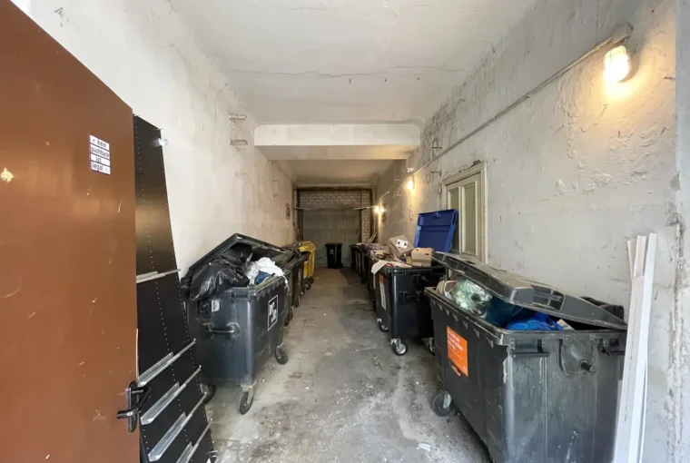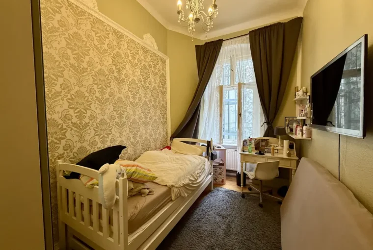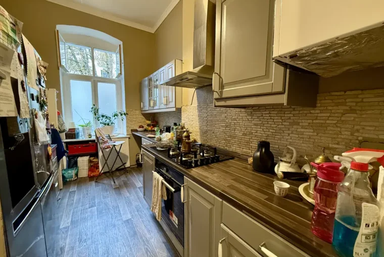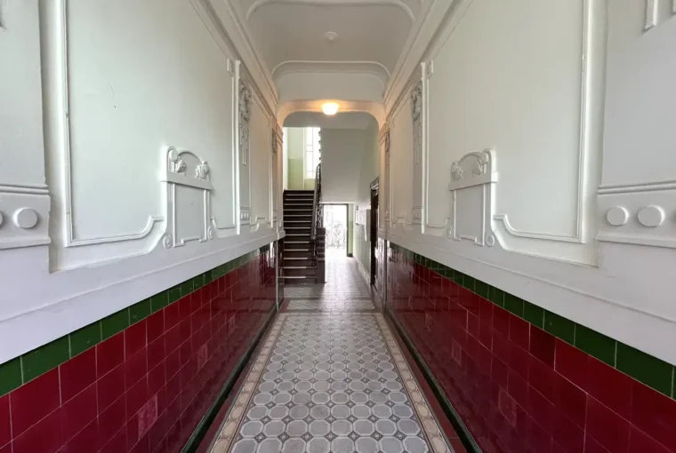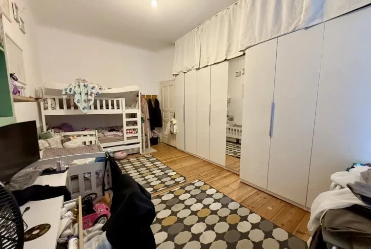 Betreten wird die Wohnung über einen zentralen Flur, von dem aus die Küche, das Badezimmer sowie ein Schlafzimmer zugänglich sind. Am Ende des Flurs öffnet sich das großzügige, offene Wohnzimmer, das durch seine freundliche Atmosphäre besticht und Zugang zu den beiden Kinderzimmern bietet. Die Wohnung wurde in der Vergangenheit aus zwei separaten Einheiten zusammengelegt. Die ursprüngliche Wohnungstür zum Hinterhaus ist weiterhin vorhanden, wurde jedoch von den derzeitigen Mietern geschickt durch einen Schrank verdeckt.