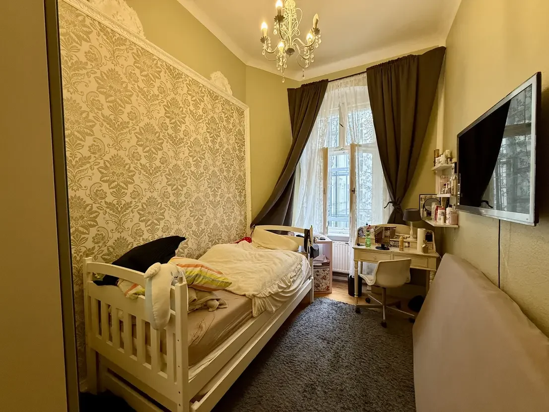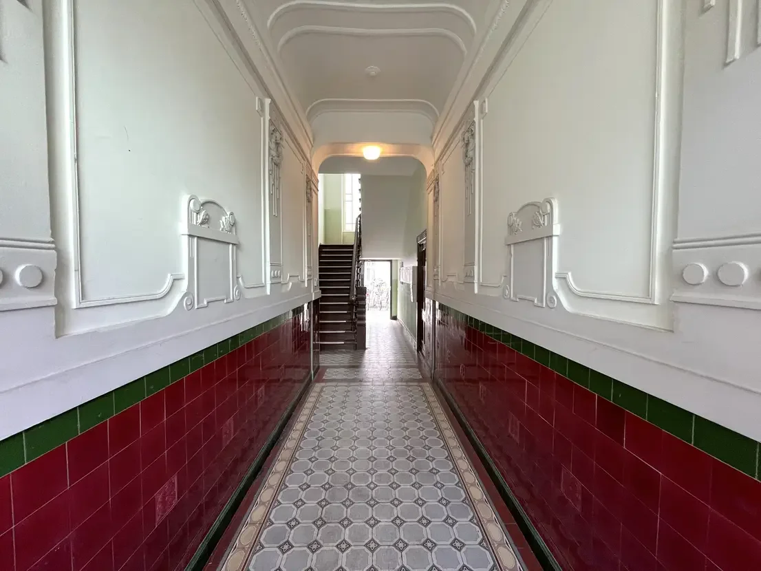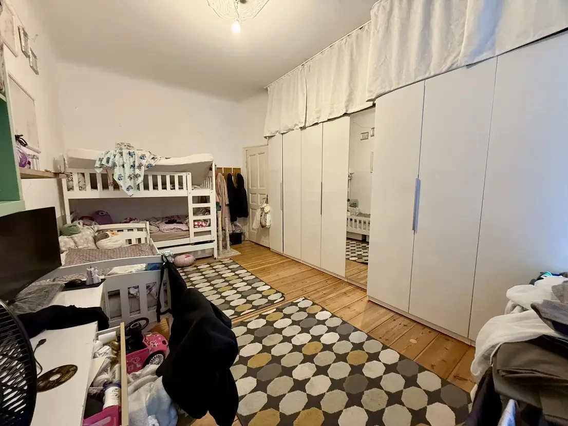 Betreten wird die Wohnung über einen zentralen Flur, von dem aus die Küche, das Badezimmer sowie ein Schlafzimmer zugänglich sind. Am Ende des Flurs öffnet sich das großzügige, offene Wohnzimmer, das durch seine freundliche Atmosphäre besticht und Zugang zu den beiden Kinderzimmern bietet. Die Wohnung wurde in der Vergangenheit aus zwei separaten Einheiten zusammengelegt. Die ursprüngliche Wohnungstür zum Hinterhaus ist weiterhin vorhanden, wurde jedoch von den derzeitigen Mietern geschickt durch einen Schrank verdeckt.