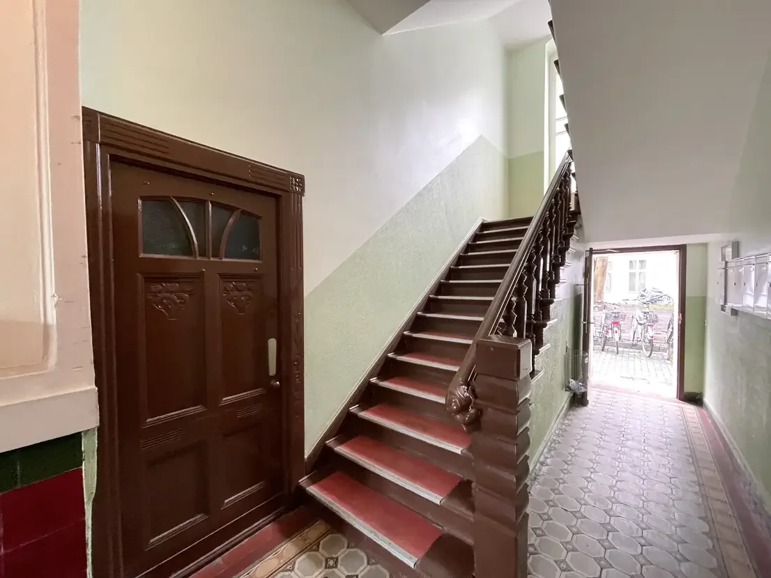 Die Wohnung befindet sich in der ersten Etage des ruhigen Seitenflügels und profitiert von einer angenehmen Wohnlage mit viel Tageslicht – ein typisches Merkmal Berliner Altbauarchitektur. Das Gebäude präsentiert sich in einem gepflegten Gesamtzustand und spiegelt den soliden Charakter der Nachbarschaft wider.